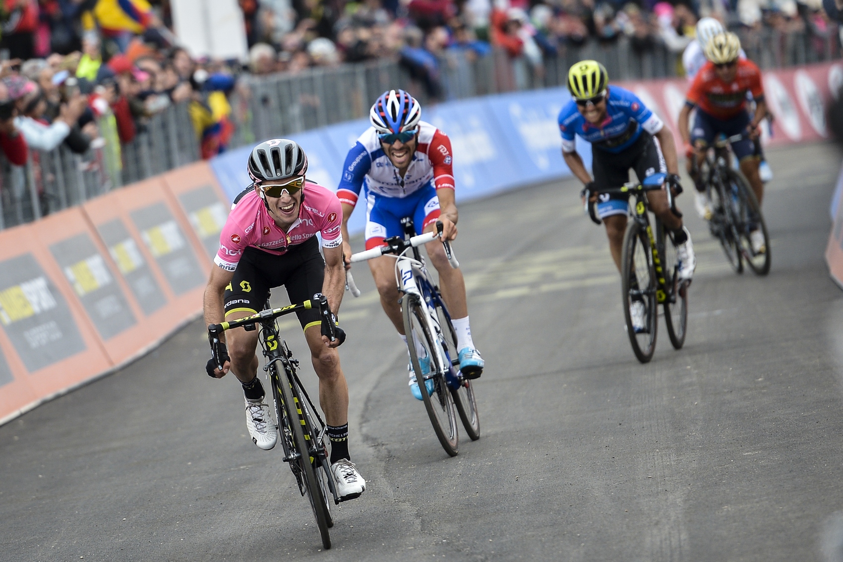 Z prvej pozície špurtoval Pozzovivo (Bahrain Merida) a zpoza neho sa vyrútil na pásku ružový muž Simon Yates (Mitchelton). Pásku preťal pred Pinotom a Chávesom. S maličkou stratou za nimi dorazili Pozzovivo a znova výborný Carapaz (Movistar). Dumoulin dostal dvanásť sekúnd spolu s Lópezom, Froome až minútu a sedem sekúnd. Aru ešte o pár sekúnd viac.