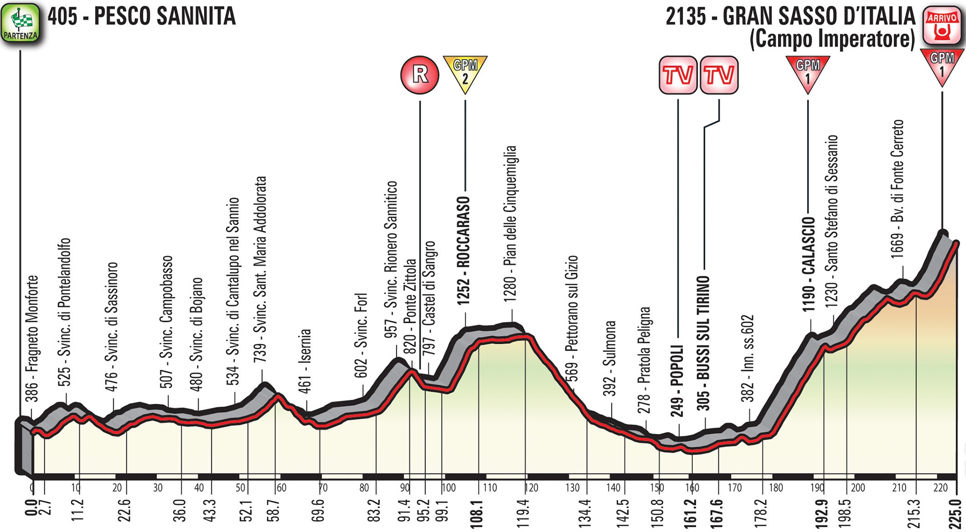 RCS Sport ostali jedinými organizátormi, ktorí ešte majú záujem ťahať pretekárov horskou etapou dlhou cez 220 kilometrov s ťažkým cieľovým kopcom. To sa už vidí iba zriedkavo. Tento deň navyše prišiel po dlhých desiatich plných presunov. Dobrou správou pre všetkých ale bolo to, že únik sa vytvoril veľmi rýchlo, prakticky už po výjazde zo štartovej dedinky Pesco Sannita v Kampánii a vyzeralo to na pokojnú etapu aj napriek tomu, že všetkých čakalo až 225 kilometrov a 4221 nastúpaných metrov.