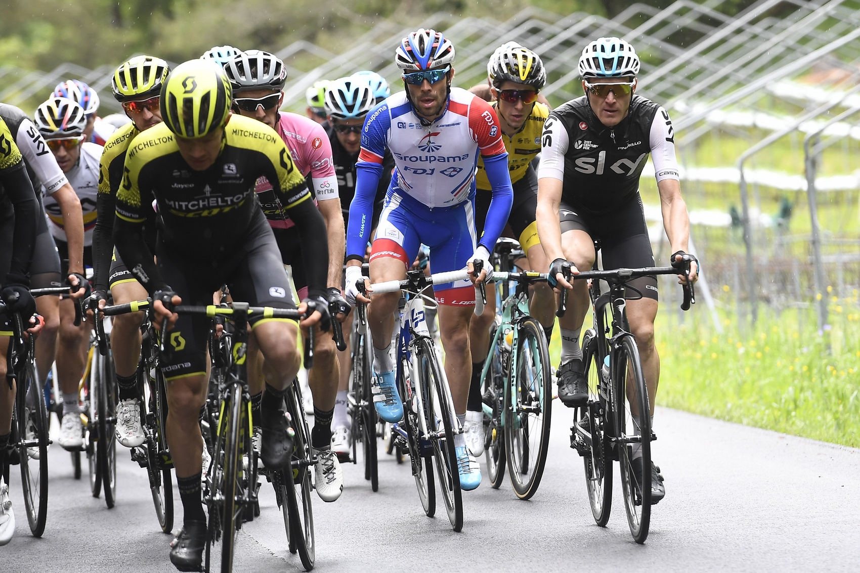 Z pelotónu bola dvadsať kilometrov pred páskou už iba väčšia skupina. Boli tam Froome, Elissonde, Henao a Poels (4x Sky), Yates, Haig a Nieve (3x Mitchelton), Dumoulin a Hamilton (2x Sunweb), López a Bilbao (2x Astana), Carapaz a Betancur (2x Movistar), Pinot a Reichenbach (2x FDJ), Formolo a Konrad (2x Bora), Pozzovivo (Bahrain Merida), Dennis (BMC), Geniez (Ag2r), OConnor (DiData) a Bennett (LottoNL).