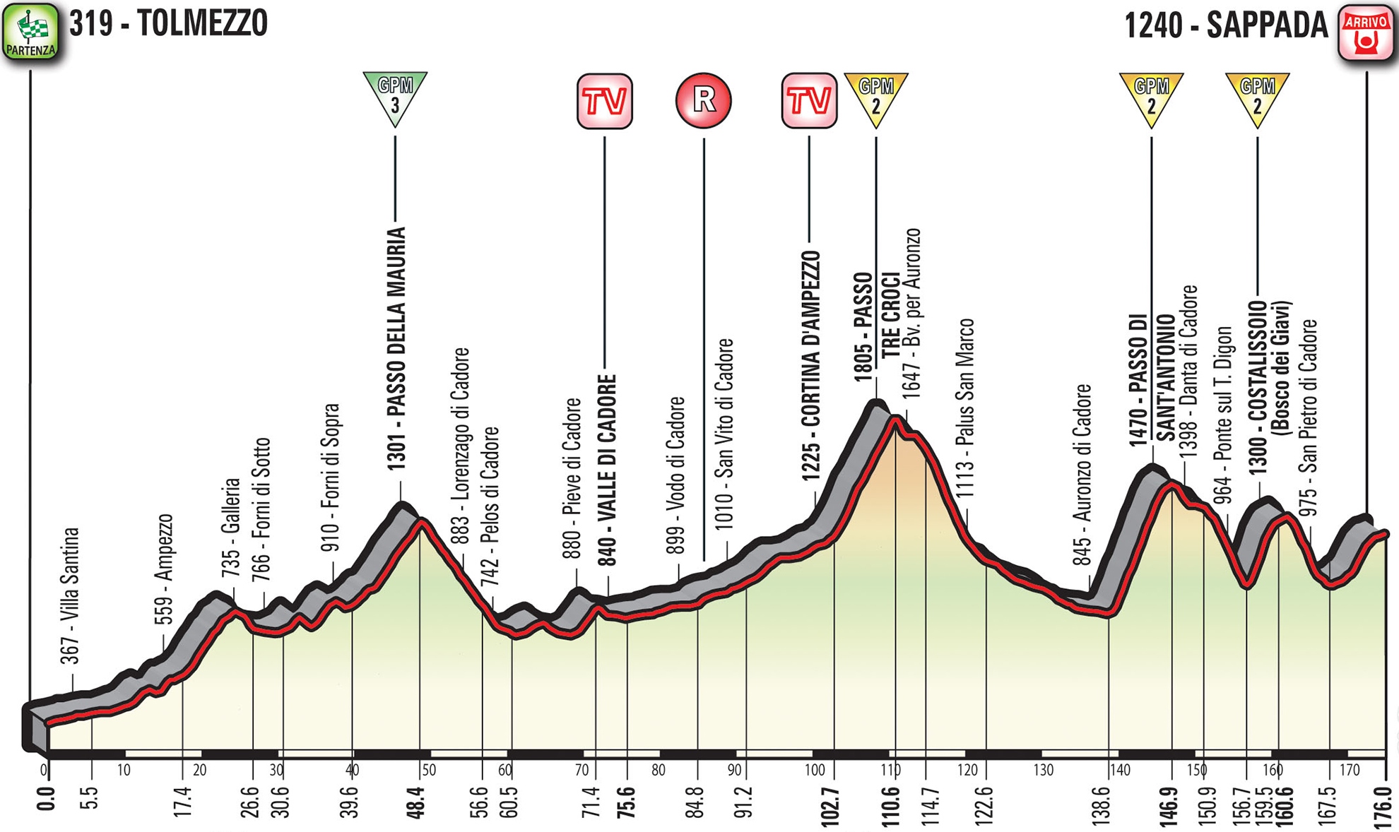 127,6 km - Passo della Mauria: dĺžka 8,8 km; sklon 4,4 %