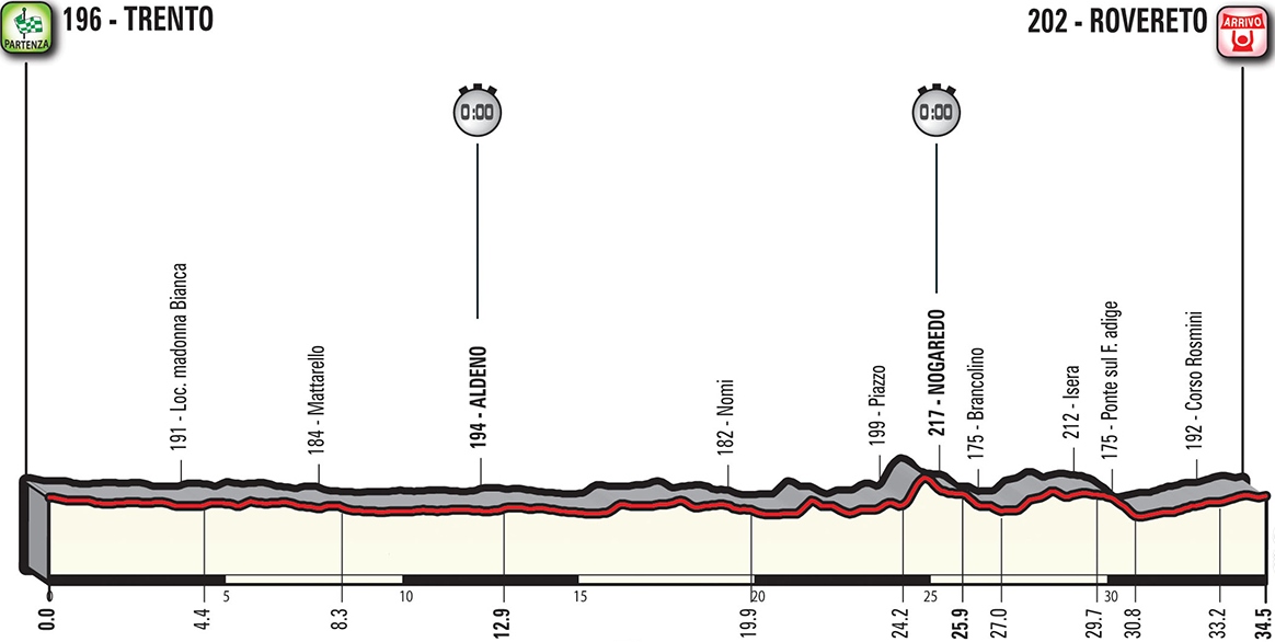 Horské etapy bude tvrdo kompenzovať rýchla jazda proti chronometru. Medzi mestami Trento a Rovereto sa nenachádzajú žiadne terénne prekážky, ktoré by zabránili jazdcom dosiahnuť najvyššiu možnú rýchlosť. Prvá polovica časovky je úplne rovinatá a jednoduchá. S príchodom do cieľového mesta sa začne profil mierne vlniť a vo finále sa objaví aj niekoľko zákrut, ale nie je to nič závažné, čo by menilo plánovaný charakter ITT, aby bola určená pre špecialistov na túto disciplínu. V regióne Trentino v blízkosti Lago di Garda dostanú univerzálni jazdci šancu na zveľadenie svojej pozícii v klasifikácii a írečití vrchári budú musieť minimalizovať svoje straty.