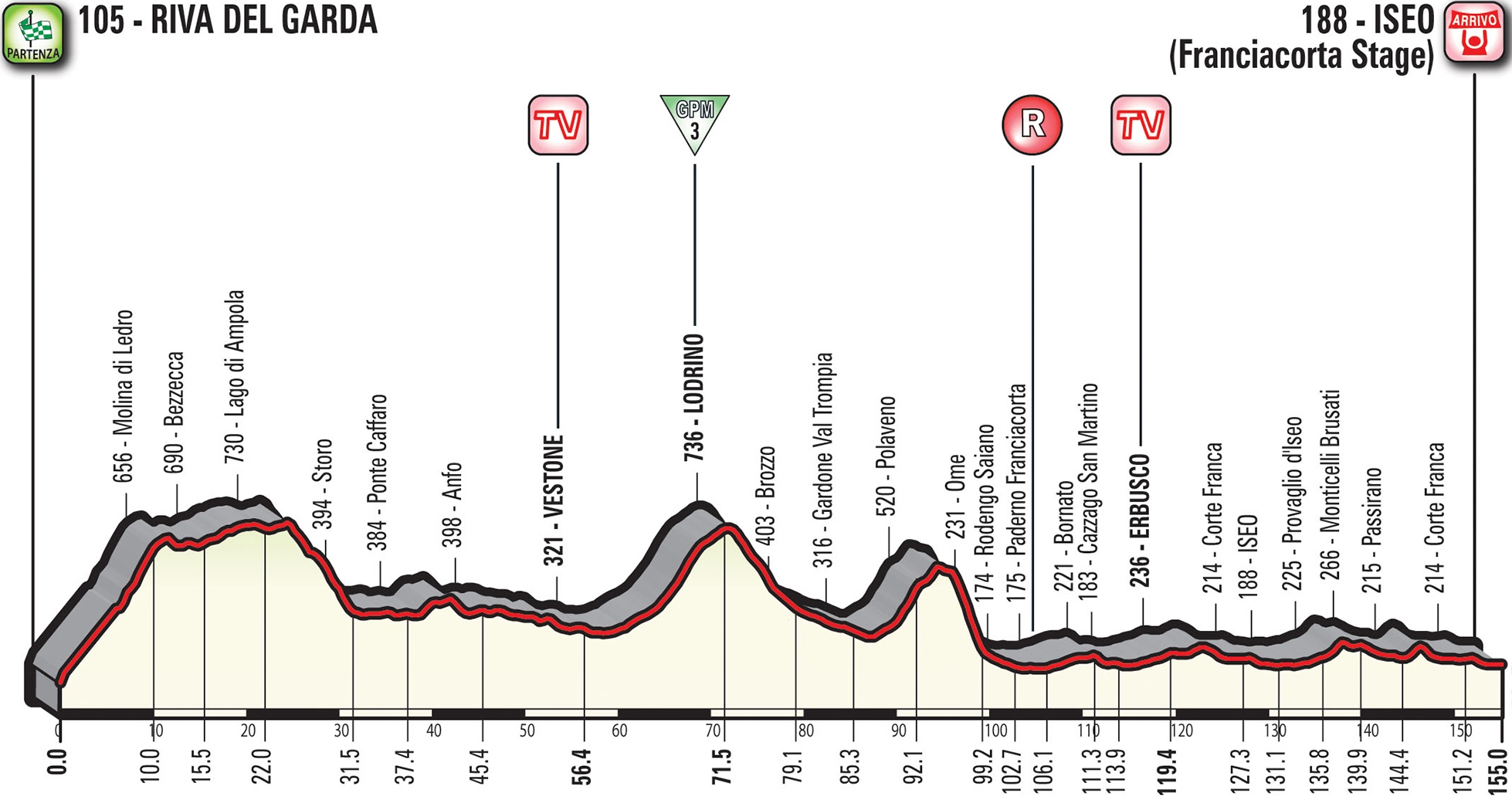 Sedemnásty deň spojí dve jazerá. Štartovať sa bude pri Lago di Garda a víťaza etapy uvidíme na brehu Lago d'Iseo v rovnomennom meste. Aj keď sú na trati položené tri stúpania, šprintéri to nemusia zabaliť hneď na štarte, pretože všetky výstupy dosahujú priemerný sklon cez päť percent, čo by mali zvládnuť. A vietor do plachiet im dodá aj skutočnosť, že posledných šesťdesiat kilometrov je úplne jednoduchých. Ak sa po prvom kopci Molina di Ledro nedostane dopredu silná skupina, šprintérske celky budú mať šancu, aby zariadili hromadný špurt balíka.