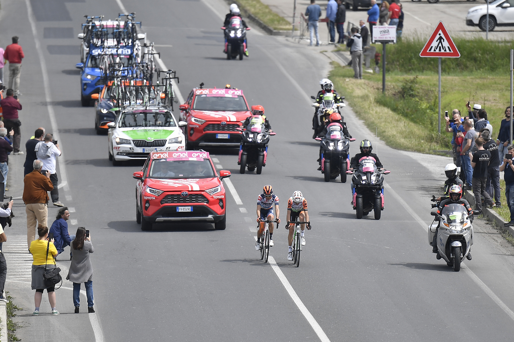 Luca Covili je 22-ročný taliansky pretekár, ktorý získal angažmán v tíme Badiani len v tomto roku, dovtedy jazdil na kontinentálnej úrovni. Na Gire prežíva premiéru a v sezóne si už vyskúšal podujatia ako Tour of the Alps alebo Coppi e Bartali. Jeho spoločník Sho Hatsuyama sa už objavil v brejku, keď v tretej etape bojoval ako jediný utečenec na čele pretekov dlhú dobu.V balíku prebrali zodpovednosť Deuceninck - Quick- Step a FDJ, teda dva tímy, ktoré sa ešte nepresadili v hromadnom špurte. Ich zásluhou náskok brejku neprekročil štyri minúty.