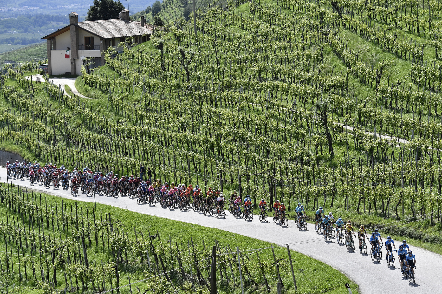 Pelotón plne dôveroval Movistaru a ten držal rozdiel medzi skupinami na úrovni sedem a pol minúty. Prvú horskú prémiu Passo di San Boldo obsypali diváci a najviac bodov ukoristil Vendrame, ktorý ako jediný vyrazil z vedúcej skupiny. Bez vzruchu sa prešlo cez prvú rýchlostnú prémiu, kde bol úspešný Marco Marcato. Situácia na trati bola stabilizovaná a brejk dokázal ešte navýšiť svoj odstup. Movistaru to neprekážalo a ani ostatné celky v pelotónu zatiaľ nedávali na známosť, že chcú niečo podniknúť ešte pred cieľovým stúpaním. Všetko tak smerovalo k tomu, že na San Carlo dorazí únik s dostatočným náskokom.