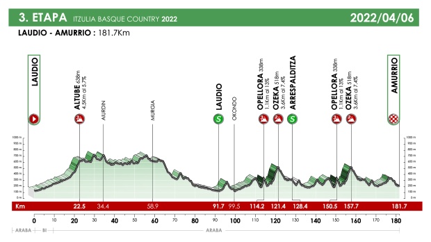 Včerajšia etapa na pretekoch Okolo Baskicka mala veľmi atraktívne a napínavé finále, no počas celého dňa sa viac-menej nič podstatné neudialo. V poradí už tretia previerka na španielskych cestách bola profilovo náročnejšia ako druhá, aj keď oproti nej ubudlo z porcie kilometrov. V stredu účastníci pretekov prešli 182 kilometrov a prekonali cez tritisíc výškových metrov. Záverečné kilometre boli na okruhu v okolí cieľovej destinácie, stúpania Opellora a Ozeka cyklisti išli dvakrát. Boli to krátke, ale poriadne tvrdé kopce.